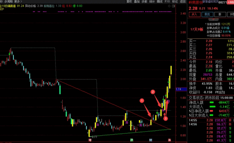 首板都100多个,因为划线是高点连接,低点连接,今年行情本身就单边下跌,所以这波政策底的反弹,首板那里一看很多符合条件的,怎么选呢,这波政策主要涉及金融地产,那其他题材我就不看了,就房产+国企+破净+低价,都差不多,前排基本要加速一字的,那我就选相对低位的,形态我喜欢的,这波反弹以金融地产为主导,茅台万亿市值3天都涨了快20个点,那就加上大而美,像XXX是吧