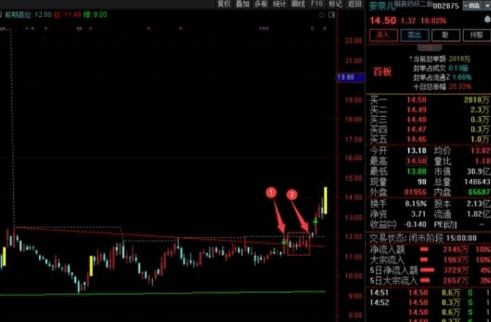 安奈儿为例子,通达信有个沙盘推演,倒回去1节点那里是开始突破,技术面是开始建仓的时候,红色框框里面都是建仓点,2节点是突破划线的同时又突破了前高