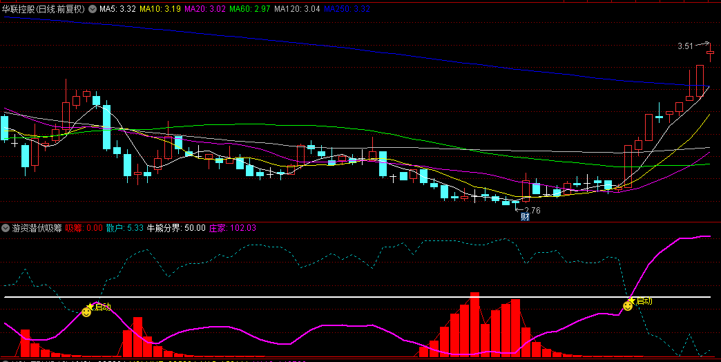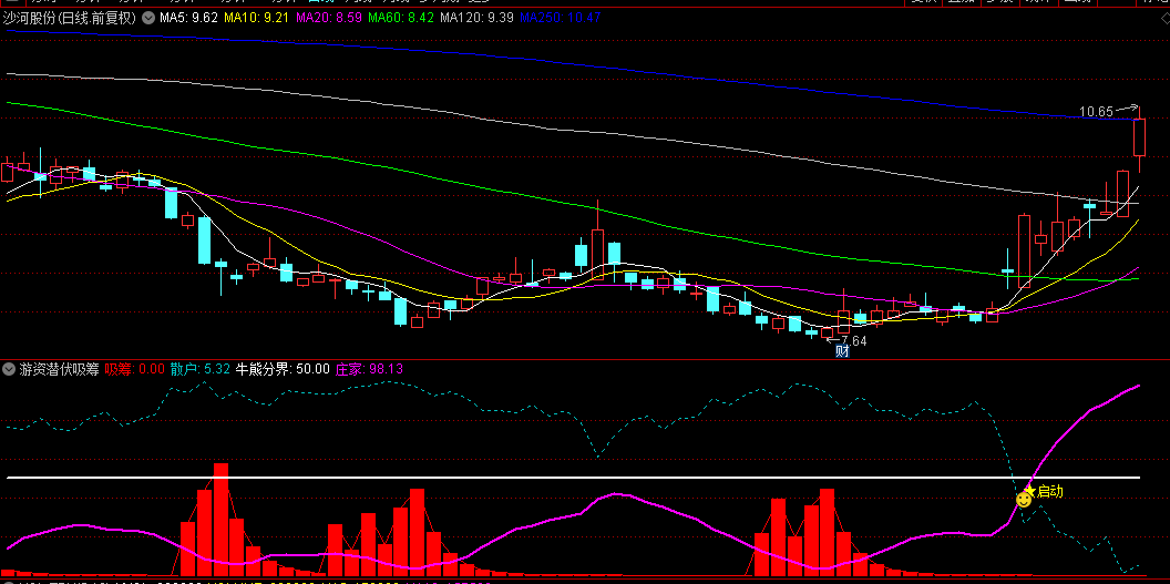 2、紫色庄家线优雅穿越散户线,形成金叉并携手攀升,此时“笑脸”图标跃然屏上,标志着启动号角正式吹响;