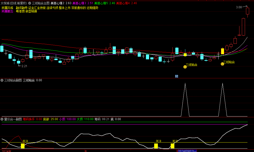 很火的【三线粘合】主图/副图/选股指标,附送量价合一副图指标,潜伏涨停抓短线波!
