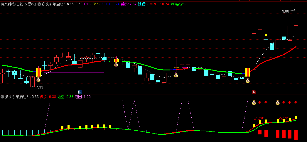 追涨有道,避高就低:紧跟红色动力线上的“钱袋”信号,结合副图向上的做多趋势,精准捕捉上涨初期的黄金机遇,同时警惕高位追涨的风险,确保每一笔交易都稳健前行。