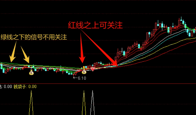 在运用该指标时,绿线之下的信号通常不具有参考价值,因为这一区域往往代表着明显的空头行情。