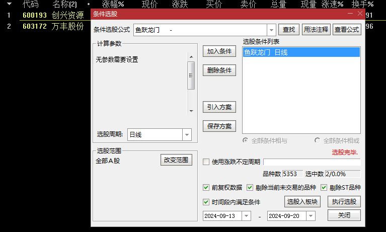 此外,我们还配套提供了选股公式,该公式在筛选过程中已自动排除了ST股、科创板、创业板以及北交所的股票,确保所选股票更加符合稳健投资的原则。