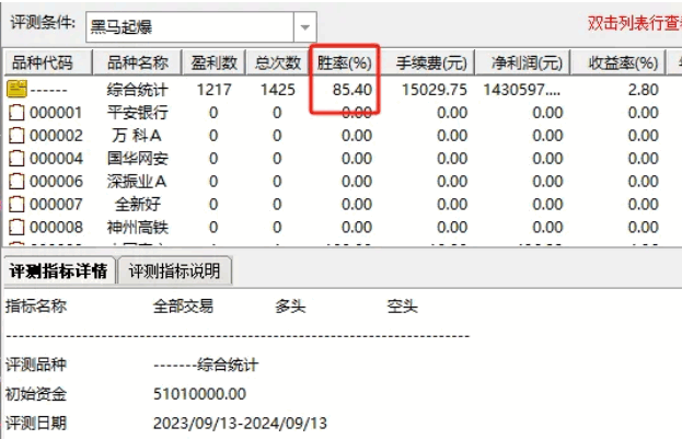 在持股五天的策略下,《黑马起爆》选股公式取得了85%的胜率,年度正向收益高达143万元,累计操作次数达到1425次。
