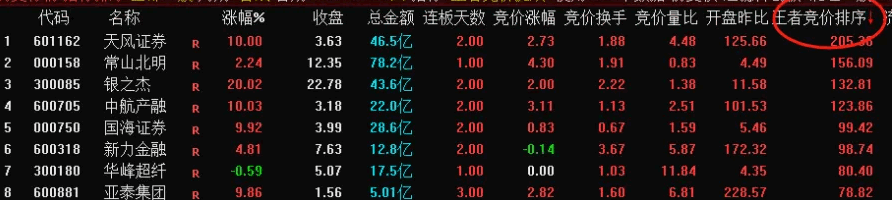 本排序界面整合了集合竞价的四大核心数据:竞价涨幅、竞价换手率、竞价量比及开盘与昨日收盘价之比;