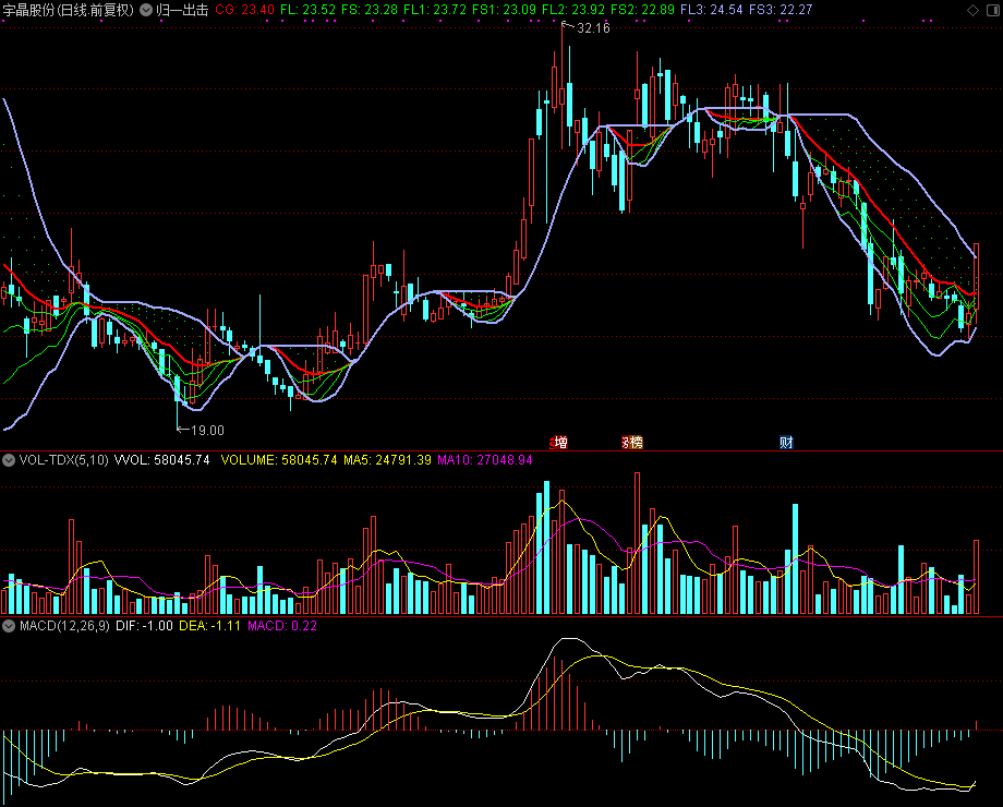 CG:MA((LOW+HIGH+CLOSE*2)/4,N),COLORRED,LINETHICK2; ZLZC3:=(HHV(H,144)-((HHV(H,144)-LLV(L,144))*0.382));