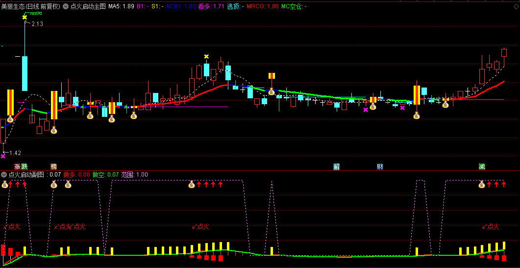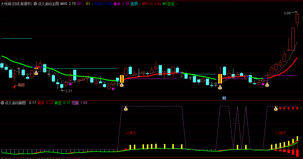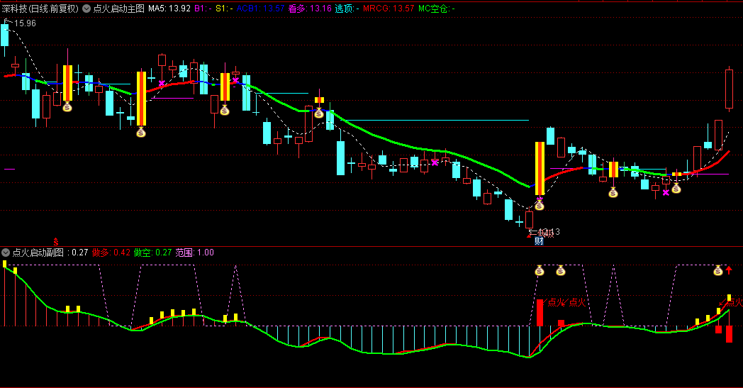 副图中,点火+钱袋子信号出现时即为买入时机,随后的红箭头信号表示可继续持有,当红箭头消失时则应卖出;使用时需结合主图综合分析。