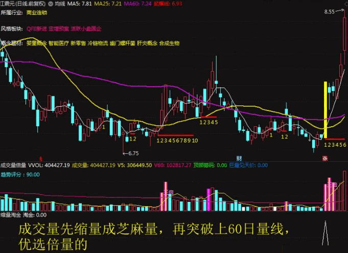 本指标的核心逻辑在于捕捉那些在经历前期成交量缩减后,再度成功跨越60日均量线的个股,同时结合多项附加条件,以确保选股结果的稳健性。