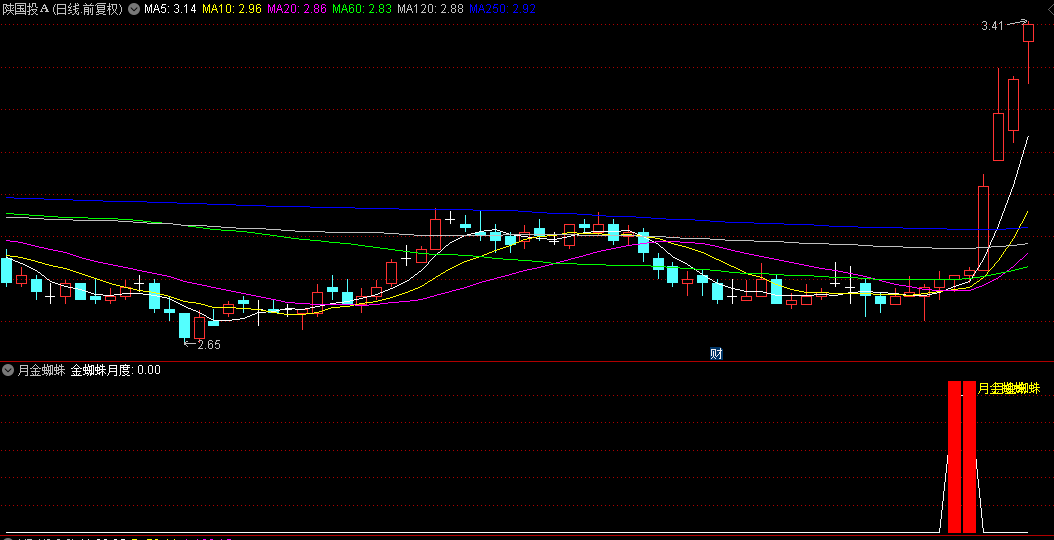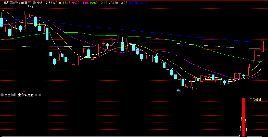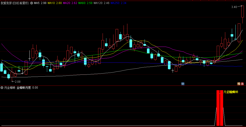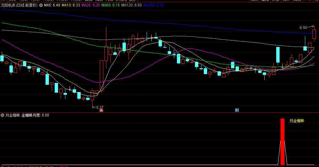 (2) 在月金蜘蛛出现后,如果股价在60日线上,60日走平,如果放量上涨买入,不破5日线可以持有。