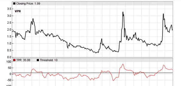 生成的图表显示了一条10%的阈值线。当VPN穿越这条线时,被认为是买入信号。我们可以看到,这些信号是有效的,但有些滞后。它们只能捕捉到价格峰值的顶部。如果使用一个滞后较小的滤波器(如2极低通滤波器或Ehlers的零滞后滤波器)来平滑指标,可能会更好。