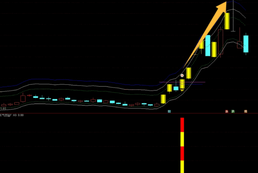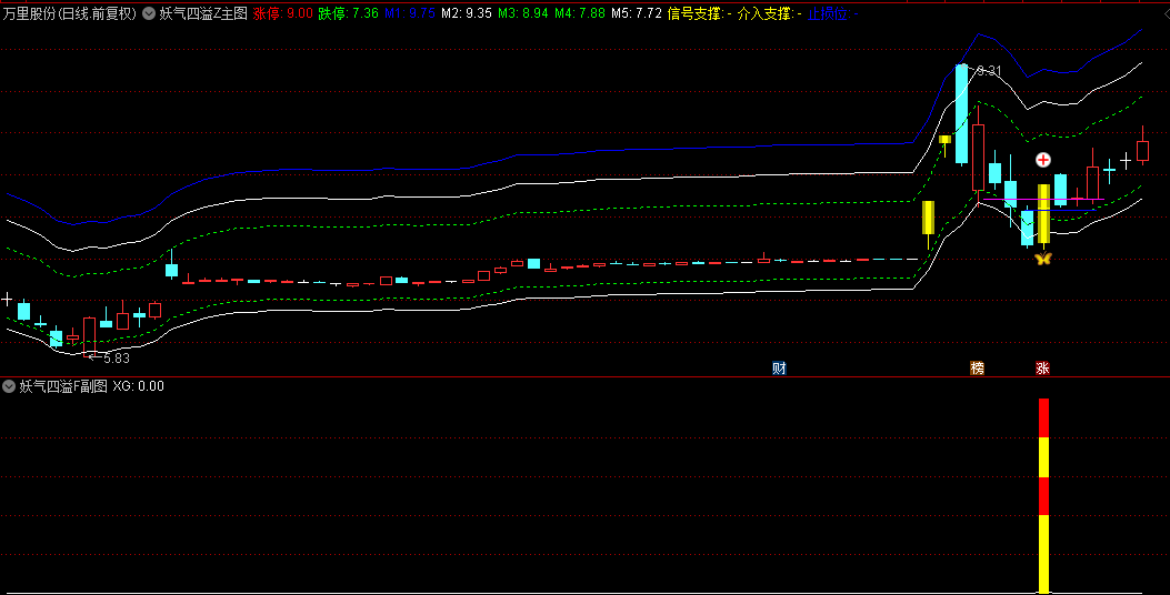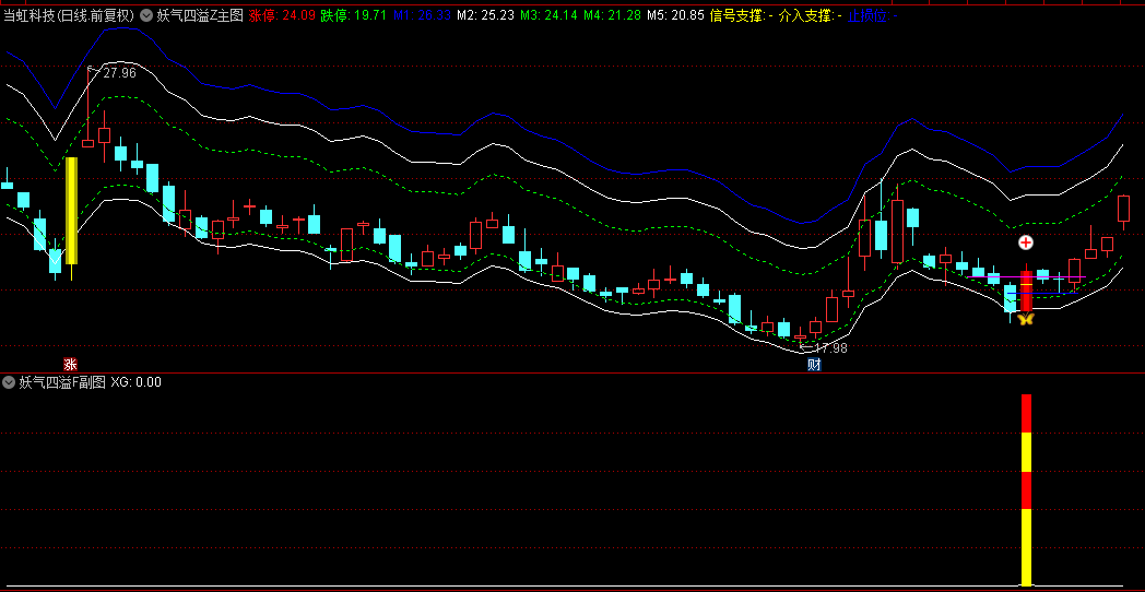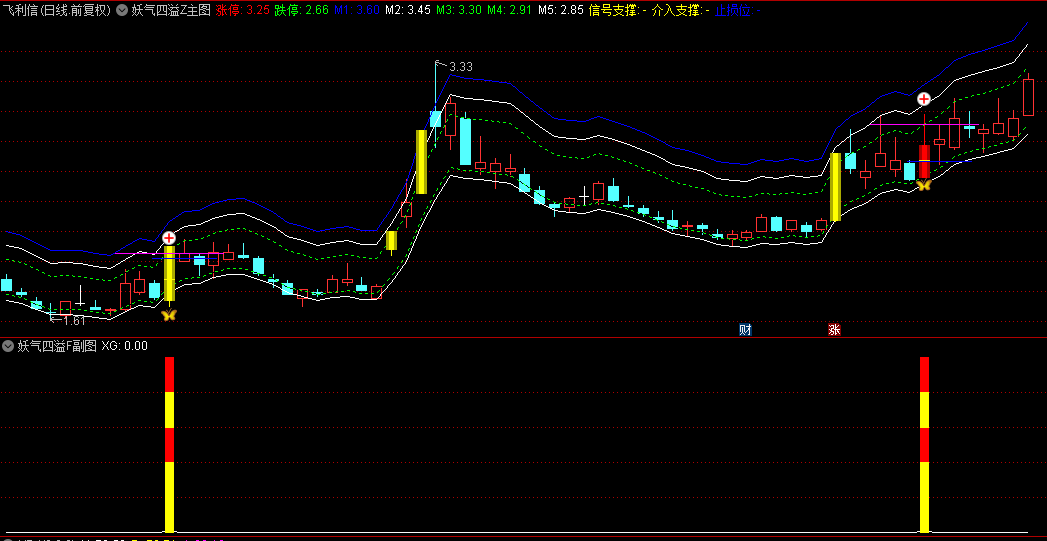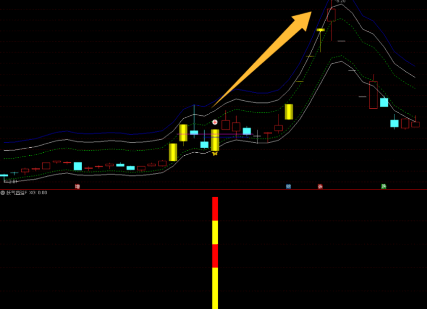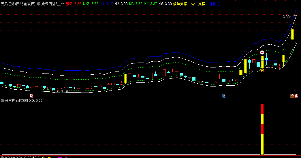 【妖气四溢】指标由一主图、一副图以及一个选股信号构成。
