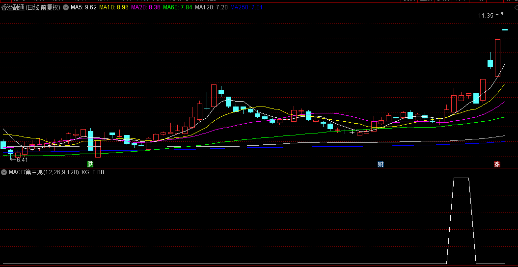我们很多朋友都研究过波浪理论、说白了就是三拉两平台、12345浪及ABC浪。经典的理论主要针对的是K线图的蜡烛线。而我研究的理论是根据MACD来跟踪这几大浪。我重点关注MACD的第三浪、也就是最肥的一块地方、我们来做一个最确定、可以重仓的短线行情。逻辑是:MACD最完美最强势的时侯是MACD从0开始红柱持续的上行、DIF、DEA、在MACD柱里面依次上行。注意DIF、DEA不能超出MACD的数值、恰好250日线的高点也被突破、并被股价顶着上移。这个时候是我们大胆介入重仓持有、并一直持有到DIF、DEA线高出MACD数值。我称之为DIF背离。一旦出现背离的时侯、我们就可以减仓。MACD第五浪的时侯就会出现顶背离、这个时侯我们仓位就很轻了、不做也罢、择时出局。例如当下的美的集团(图1)、中山公用(图2).我们可以发现、不管股价在底部也好、在高位也好、只要出现MACD这种形态、我们都可以定义为MACD第三浪、会有一波像样的行情或者反弹。而不是天天看着蜡烛线去数浪。这种形态风险小、收益大、确定性强。而且这个可以用选股选出来的。我在指标上用红黄双色柱做标记、当然一旦进入到上一篇文章讲解的股价突破阶段性高点、MACD也突破阶段性高点、我就会在MACD上标记B字样。我这理论的特点就是、都是选择最强势的、股价、量能(重要价位突破必然放量)、MACD皆是最强势的。人气最爆棚的一段时间。诚然量化资金也会追捧。我们可以关注一下、前期我为了研究MACD背离形态对股价的杀伤力、跟踪了很久的短周期线。发现一个特点:就是只要MACD出现一点点背离、大单马上就砸了下来、很明显这都是机器人干的。感兴趣的朋友可以一起研究一下。蓝屋出品皆是精品。
