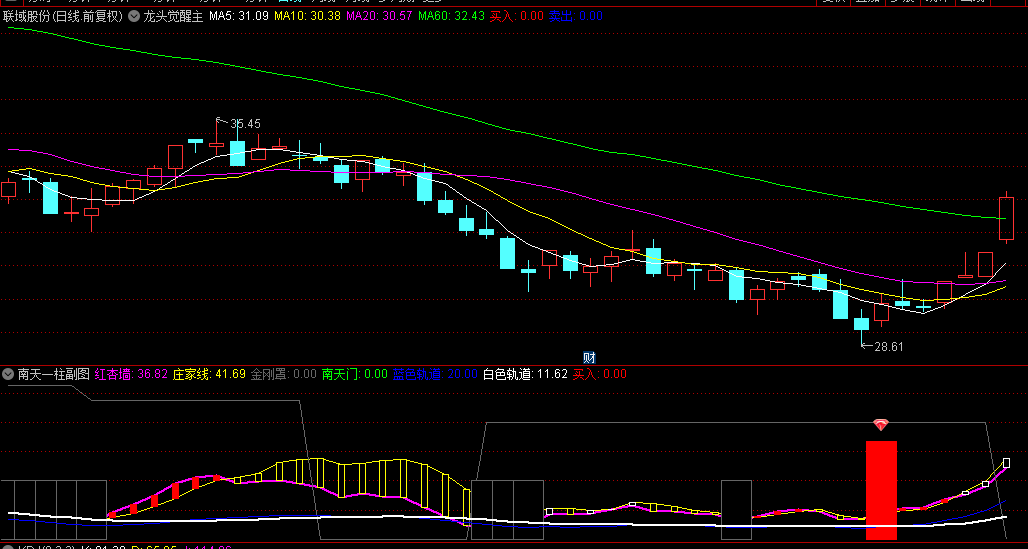 南天一柱设置的买入信号是红色柱体、红钻和输出线行显示买入:1。