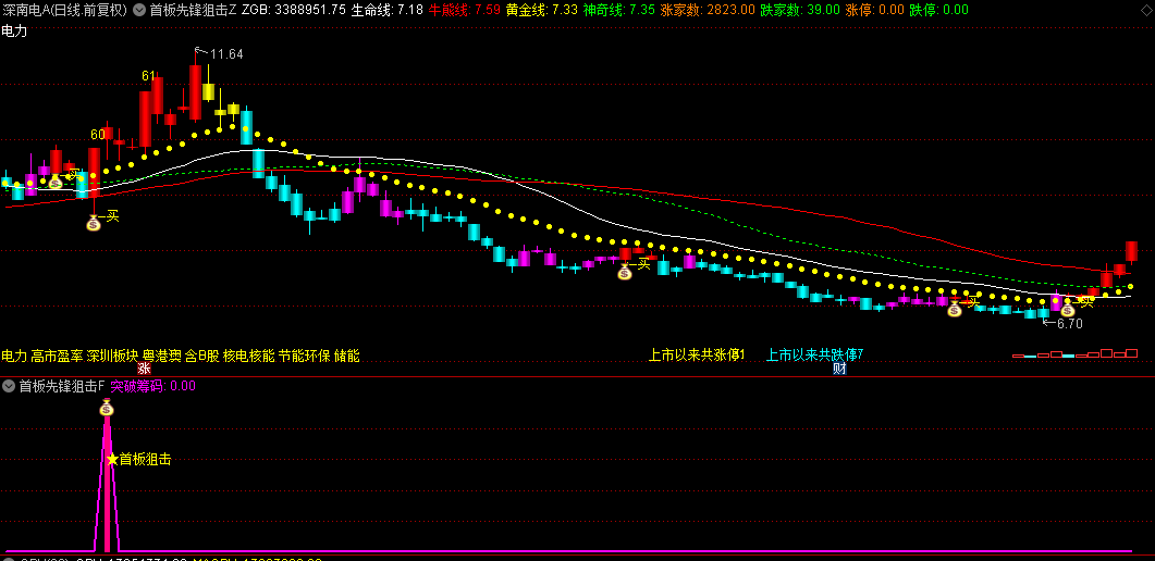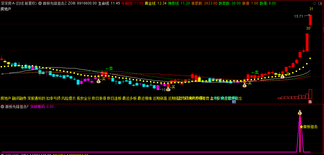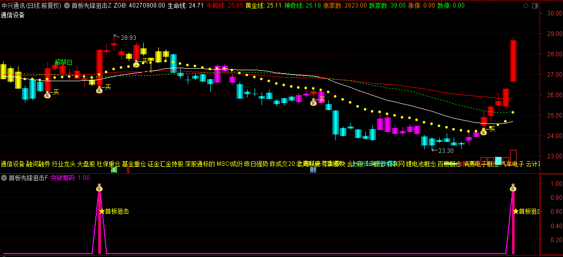 “首板先锋狙击”指标的核心在于两个关键环节:涨停预警与精准狙击。涨停预警如同股市中的雷达,能够敏锐捕捉个股即将迎来涨停板的信号。它基于对市场热点题材、资金流向以及个股技术指标的深度分析,提前预判个股的涨停潜力。而精准狙击则是在涨停预警发出后,投资者需要密切关注主副图上的指标变化,一旦狙击信号出现,便迅速行动,把握买入时机。