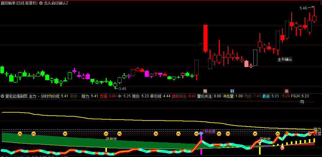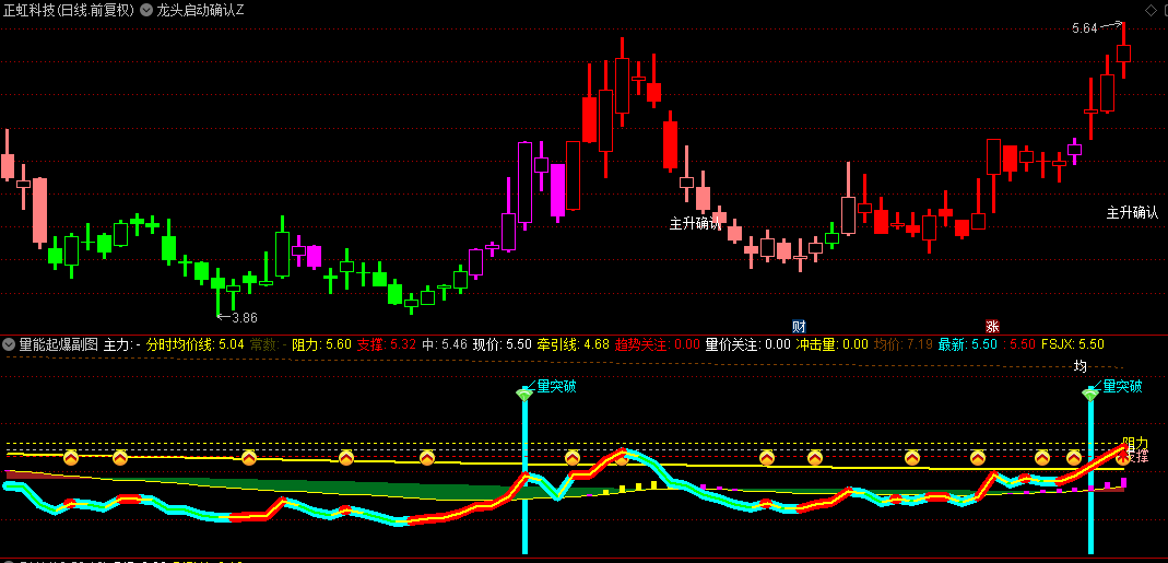在“龙头启动确认”的指引下,您可以清晰地看到个股在市场中的龙头地位。当主图指标释放出明确的买入信号时,便是您果断出击的最佳时机。此时,结合副图指标“量能狂潮”的确认,您可以更加自信地把握打板机会,轻松锁定市场热点。