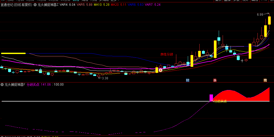 指标由主图和副图两部分组成,二者相辅相成,共同为投资者提供全面的交易参考。在主图上,我们特别标注了“良性分歧”的识别标志,当股票出现这一特征时,便意味着它可能即将迎来一波强势上涨。此时,投资者可将其加入自选股,进行进一步观察。而副图则负责提供更为具体的买点信号,一旦信号确认,投资者便可盘中适时介入,把握最佳投资机会。