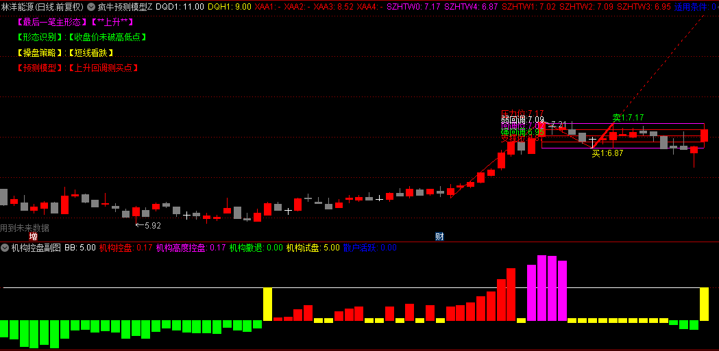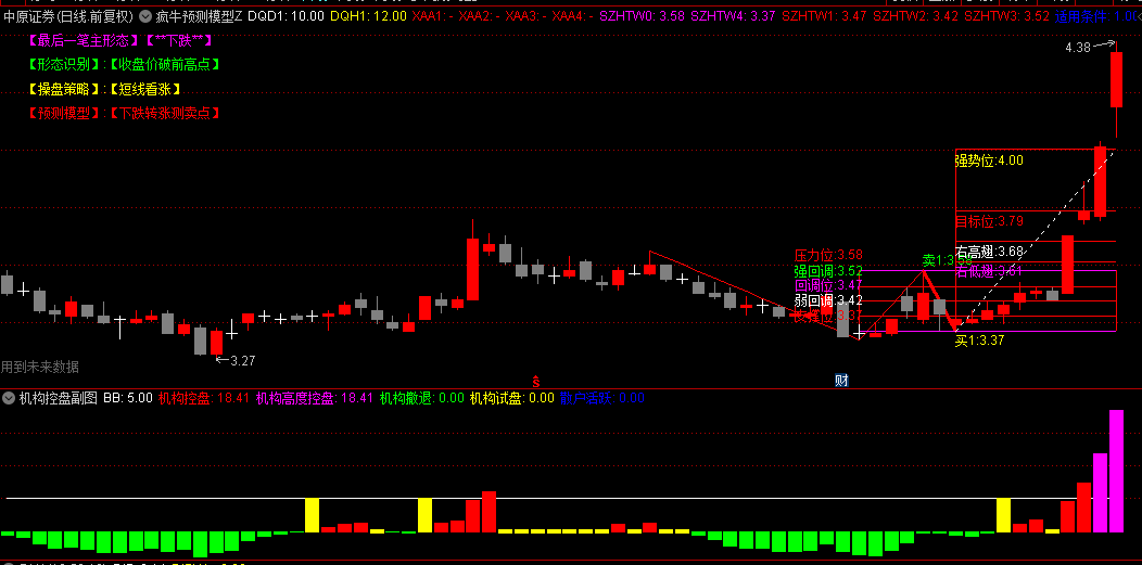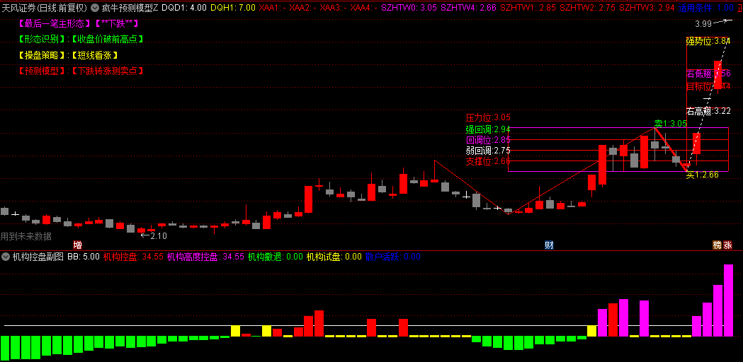通达信【疯牛预测模型】主图+【机构控盘】副图套装指标,结合了多种技术和算法,预测和判断涨跌趋势!