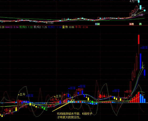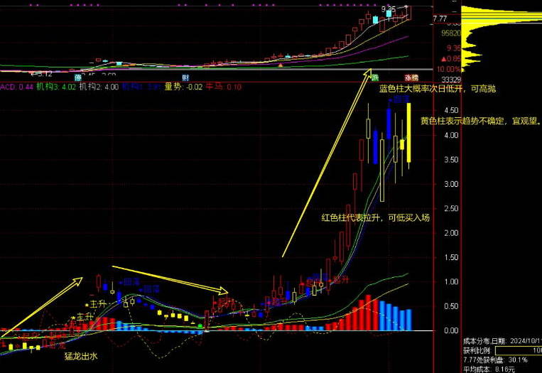 首要之处在于辨识主升浪的先机。当机构线紧贴静水面,仿佛蓄势待发的猎豹,经过一段时间的静默横盘后,一旦猛然跃起,往往预示着主升浪的序幕已经拉开。相反,若机构线自深水域奋力挣扎而出,其过程消耗过大,后续动能恐难以维系,上涨之路或将荆棘密布。