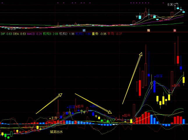 谈及"蛟龙腾空"这一指标的命名,灵感源自于自然界中蛟龙破水而出的壮观景象,它寓意着当指标中的K线与机构线携手突破那无形的0轴界限(我们称之为“静水面”),股价便如同蛟龙般蓄势待发,展现出惊人的上升动力与速度,仿佛天地间任其遨游,呼风唤雨,无所不能。
