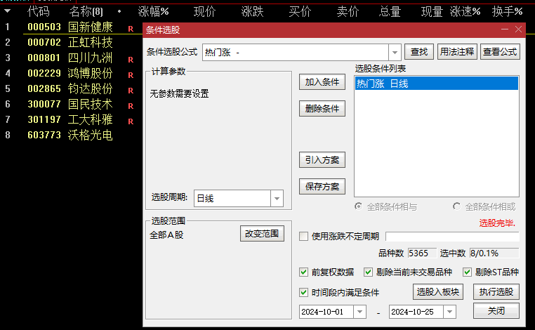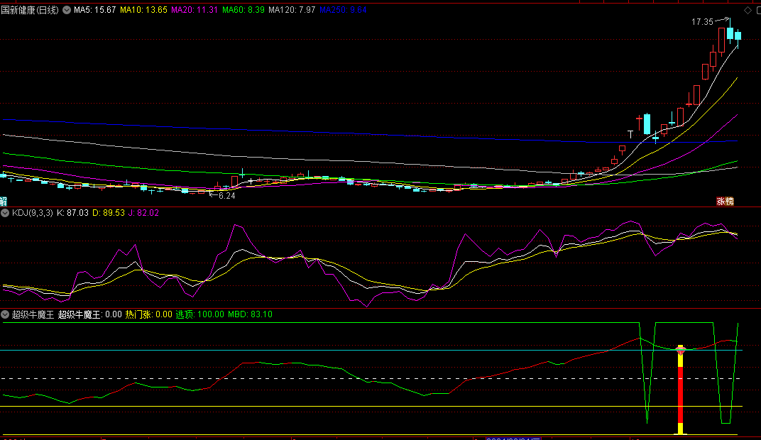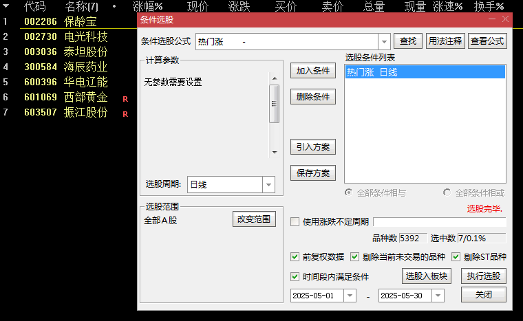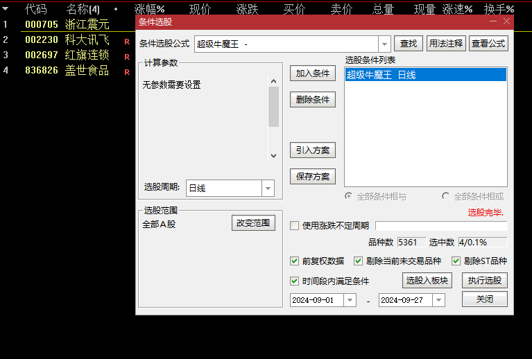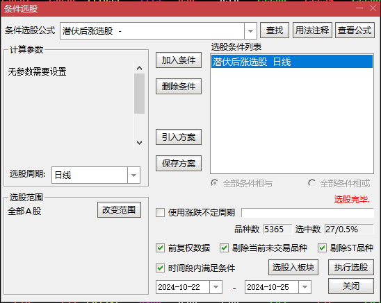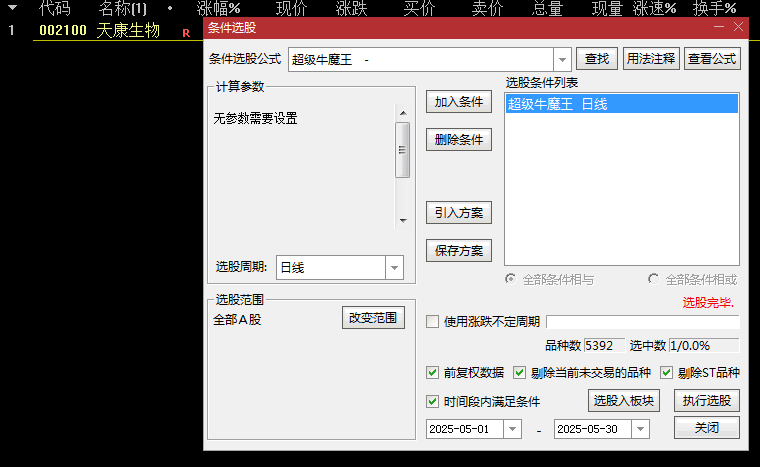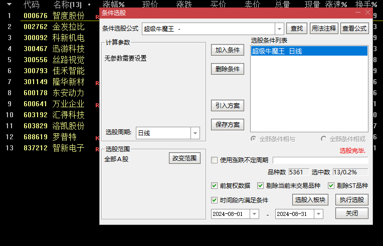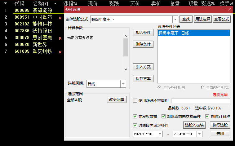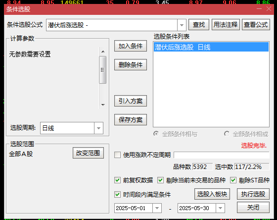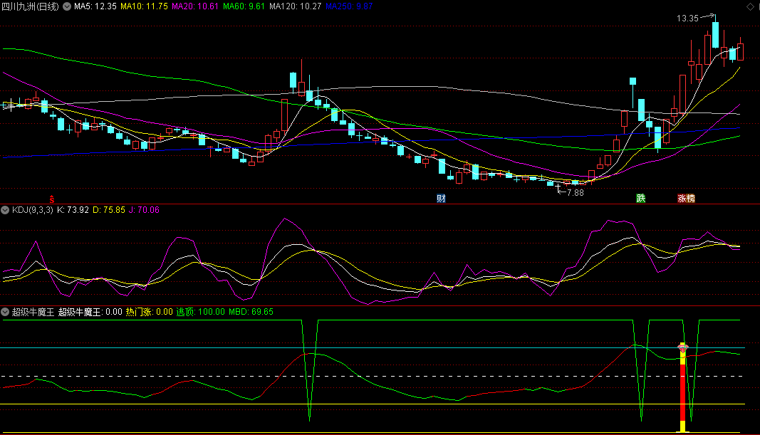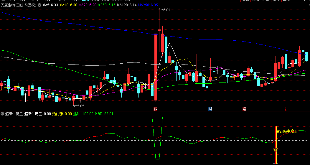 超级牛魔王信号比较少,因此新增了热门涨和潜伏后涨选股两个信号,大家可以看需要做参考。热门涨有追热点和涨停的性质,若与高位卖出信号重叠,建议以安全操作回避为主。潜伏后涨信号较多一些,通常是横盘一段时间后潜伏进去。