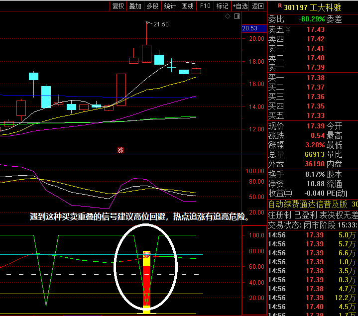 高位卖出:当红转绿线逼近蓝线时卖出信号,若同时出现倒三角绿线时是强卖点信号,注意高位风险。