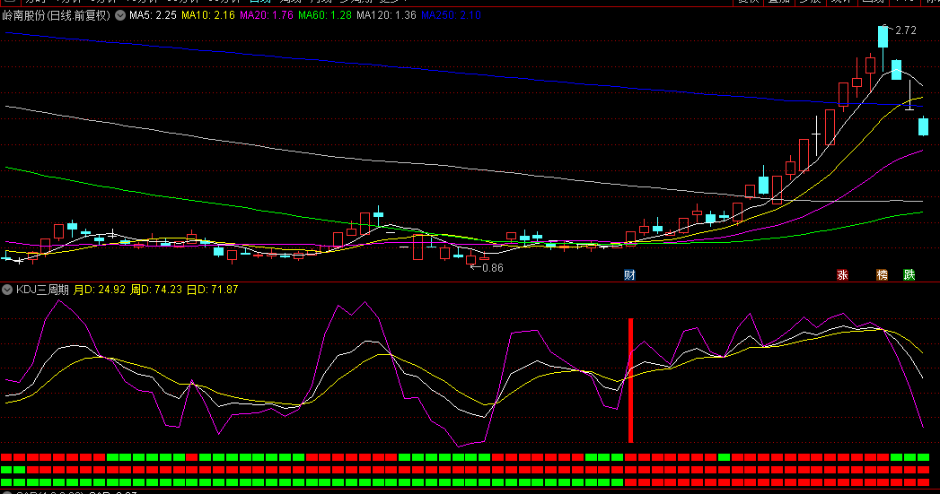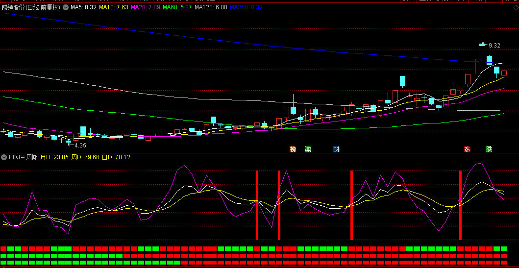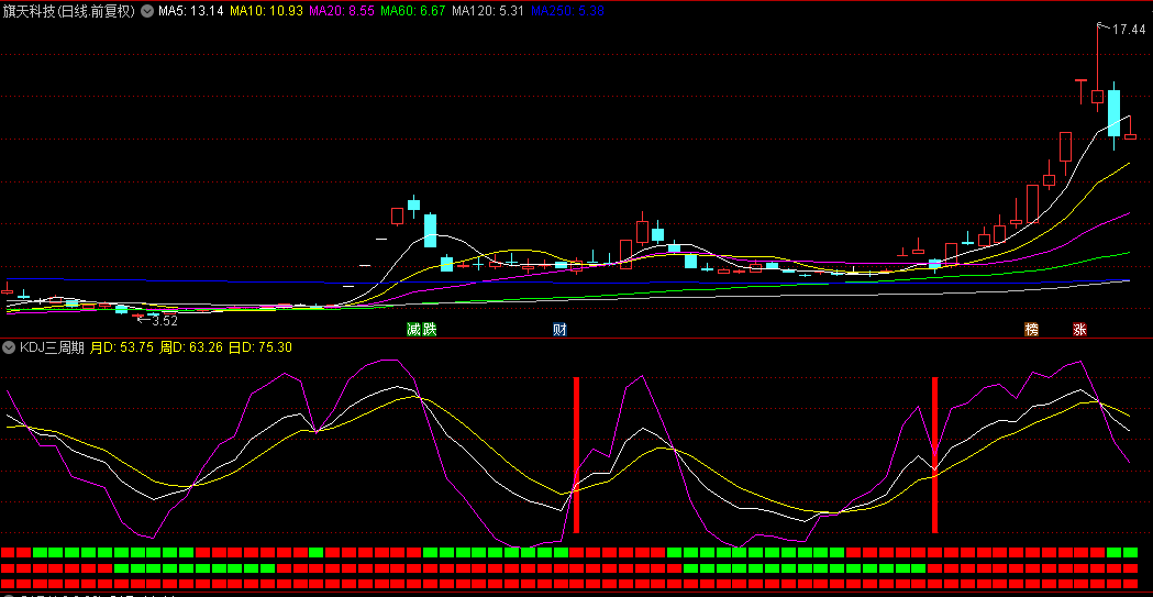 在这副图中,色彩的运用尤为巧妙。副图底部,红绿方块交替出现,它们代表着不同时间周期下KDJ数值的微妙变化。
