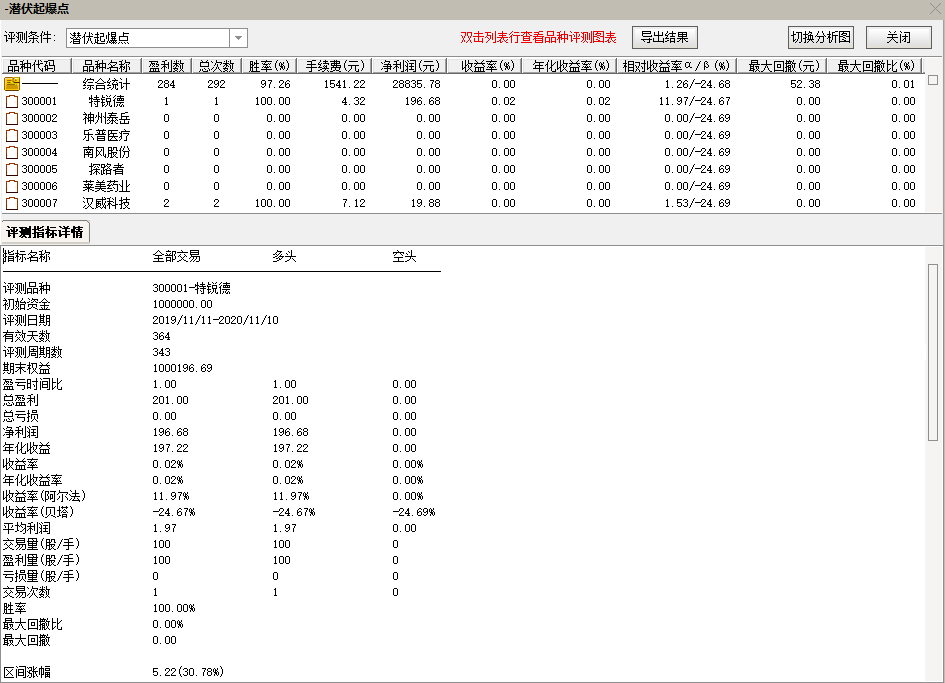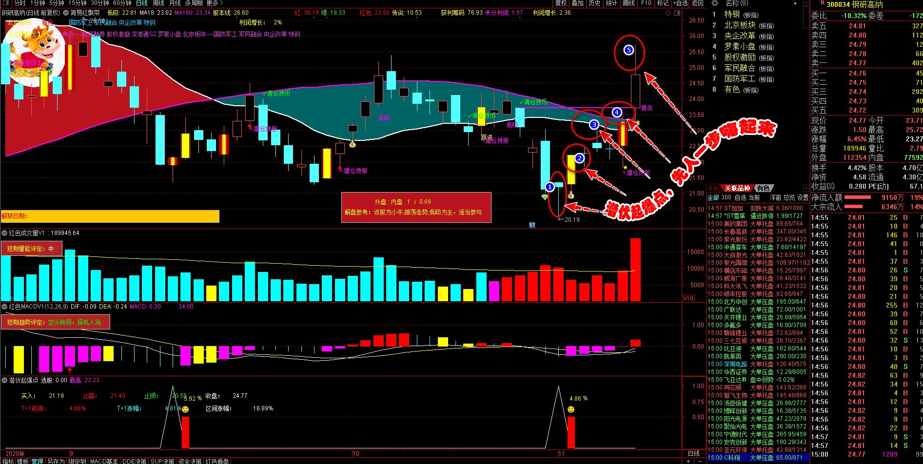 尾盘进,早盘出。起爆前,宜潜伏。先人一步嗨起来,大阳拉起我先出。潜伏起爆点指标是针对创业板注册制编写的一款实战指标。该指标延续了尾盘战法精、准、稳的优点,注重从创业板个股大幅度拉升前寻找最佳潜伏点,用最优的市价格潜伏到可能拉升的个股之中,在个股大幅拉升时及时抛出,成功锁定利润。该战法不同于传统的追涨战法,传统的追涨战法一般在大阳拉起当天介入,第二天冲高时卖出。潜伏起爆点则正好相反,在大阳拉起前一天尾盘买入,大阳拉起当天逢高卖出。当市场上有人庆幸自己当天抓到大阳线或涨停板的时候,也许你已经落袋为安了。先人一步嗨起来,大阳拉起我先出。这样的操作不是更香吗?