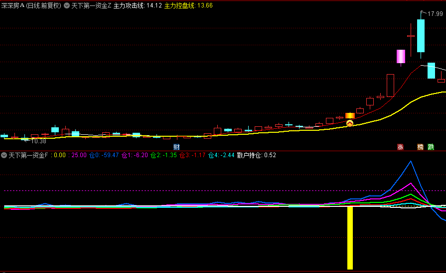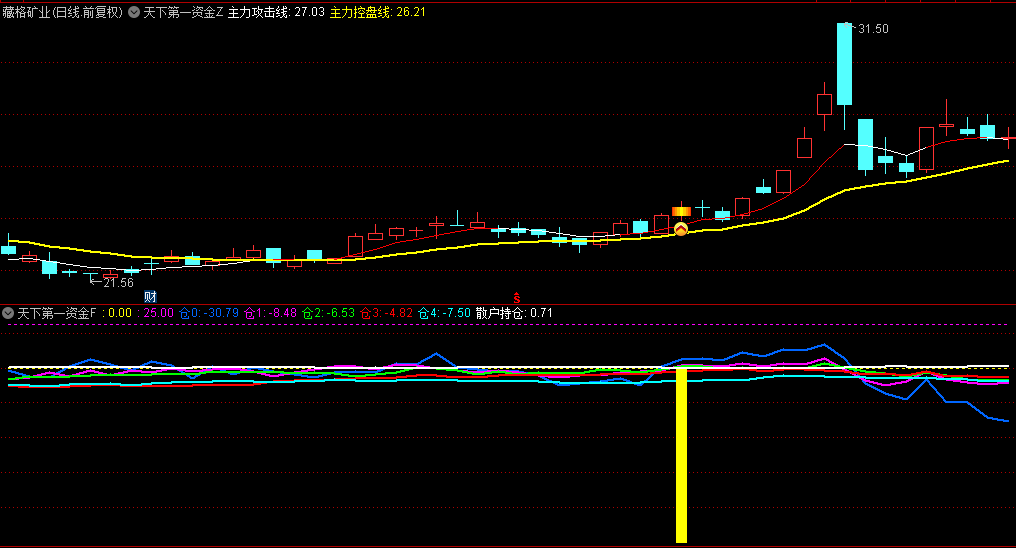 副图指标中,六条色彩斑斓的线条与一条清晰的白色参考线(即0轴)交织在一起,共同绘制出资金流动的复杂图谱。