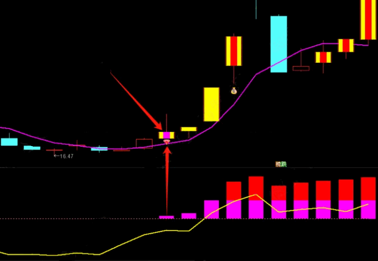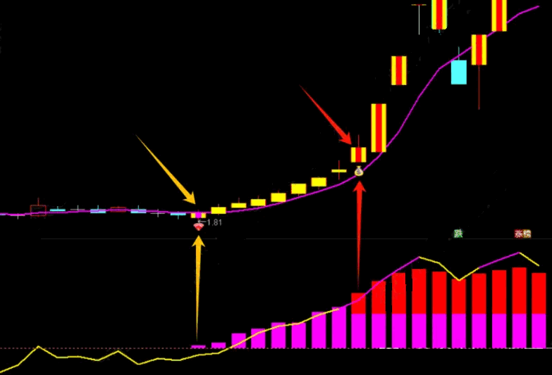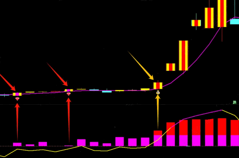 1、当主图显现金色K线,同时副图出现紫色立柱,此时再出现红宝石信号,此刻便是布局入市的良机。