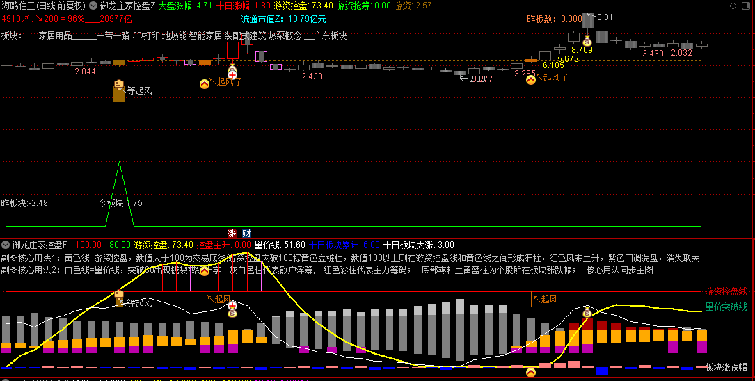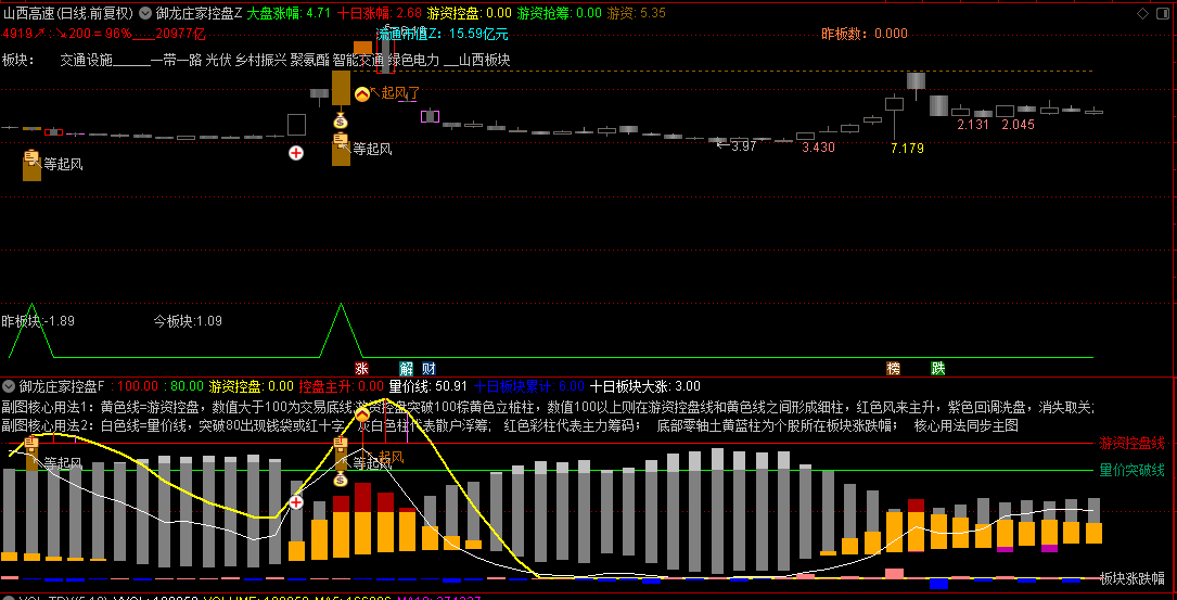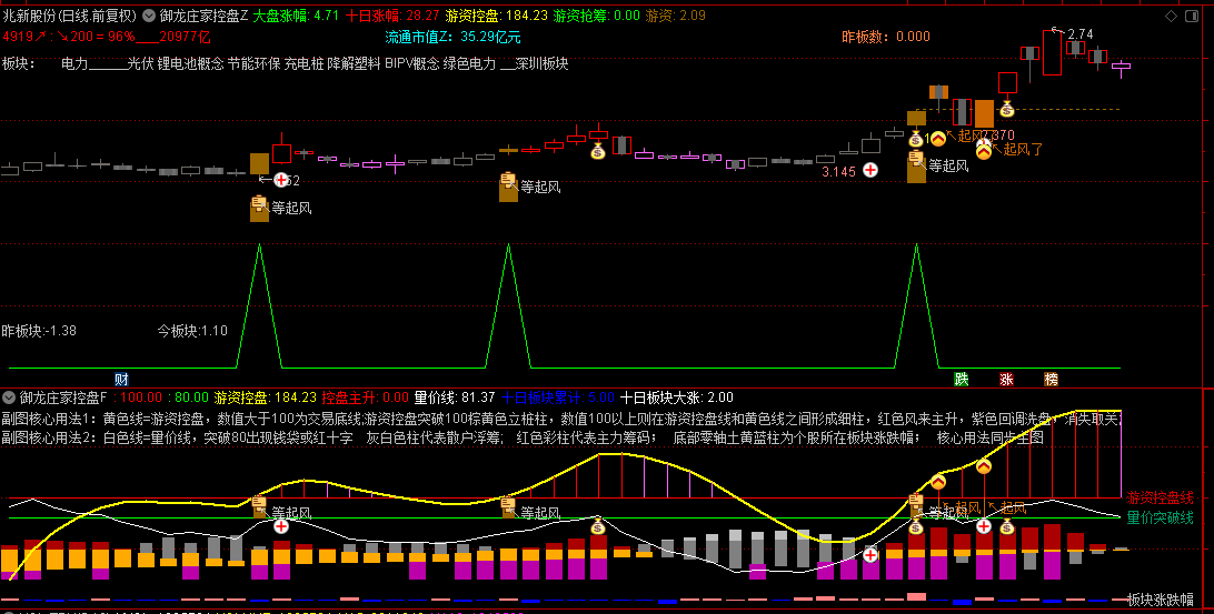 2、御龙庄家控盘副图指标中,分为三大区域,分别为庄家控盘高位区,主散浮筹中位区,低位区则属于板块涨幅;