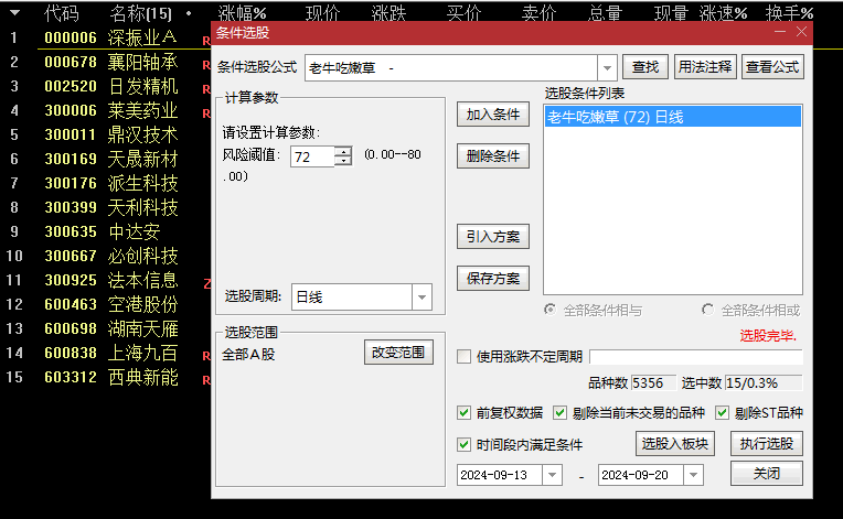 想更稳健,调整风险阈值为55,会大大缩小结果范围,少而精,不在赘述,配合副图参见: