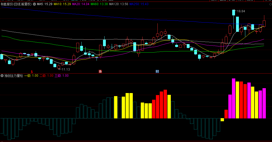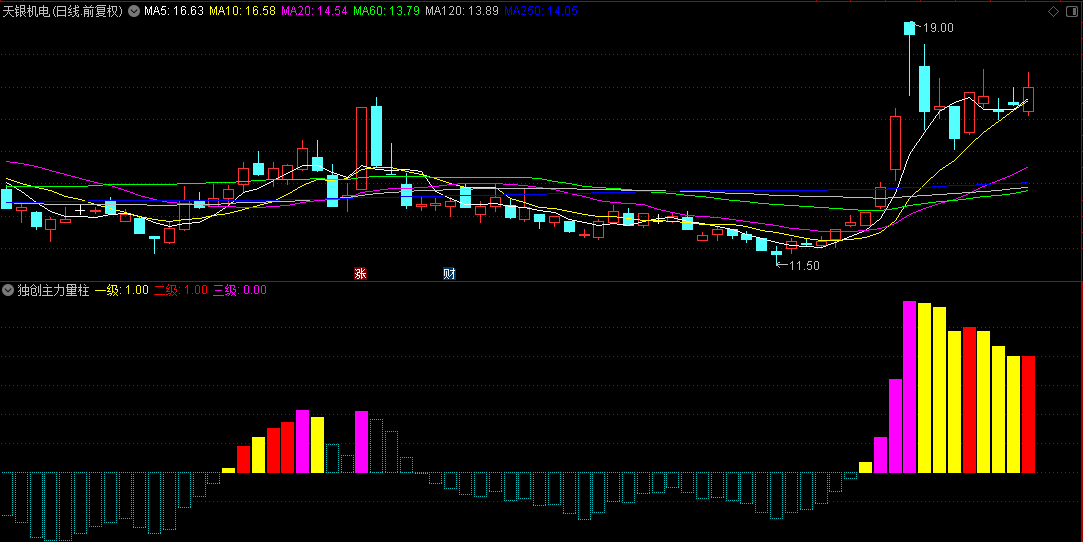 在指标中,我将量柱分为三种颜色:洋红色代表强势,红色代表中势,而黄色则代表弱势。