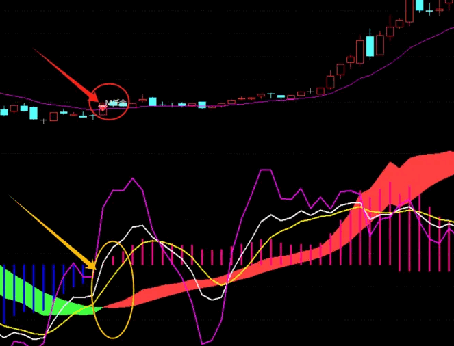 为了更直观地展示市场趋势,我们还特别设置了MACD红柱发散时显示“红飘带”,绿柱发散时显示“绿飘带”。