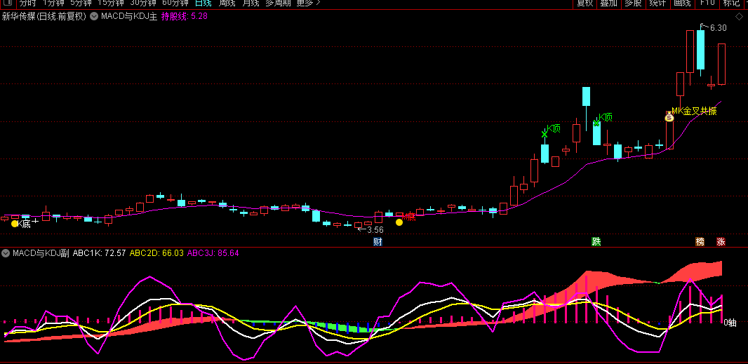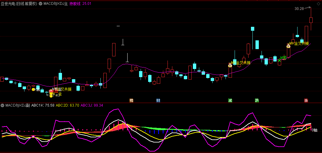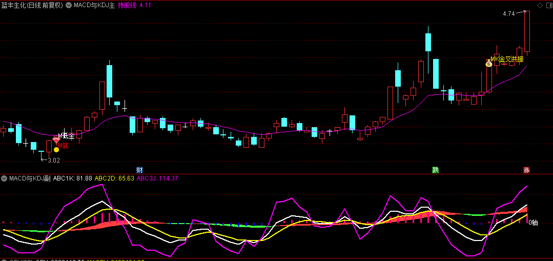 在副图中,MACD与KDJ指标被巧妙地叠加在一起,形成了独特的分析视角。