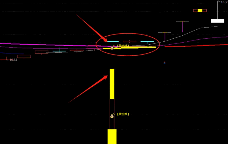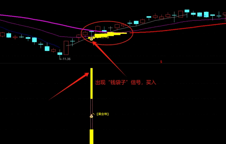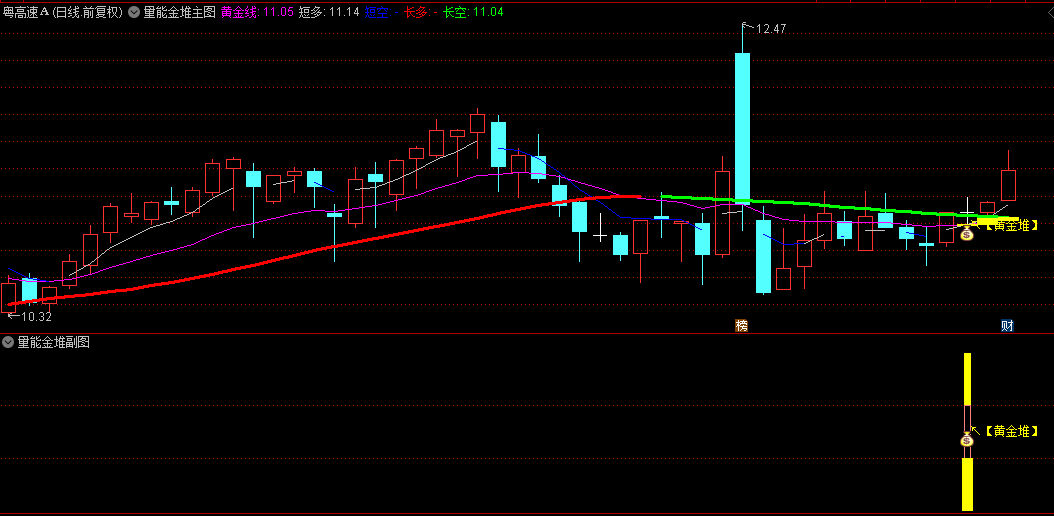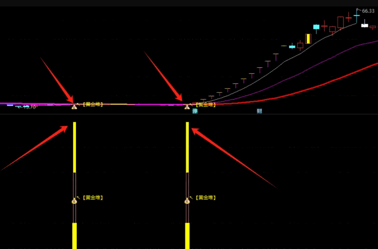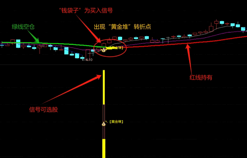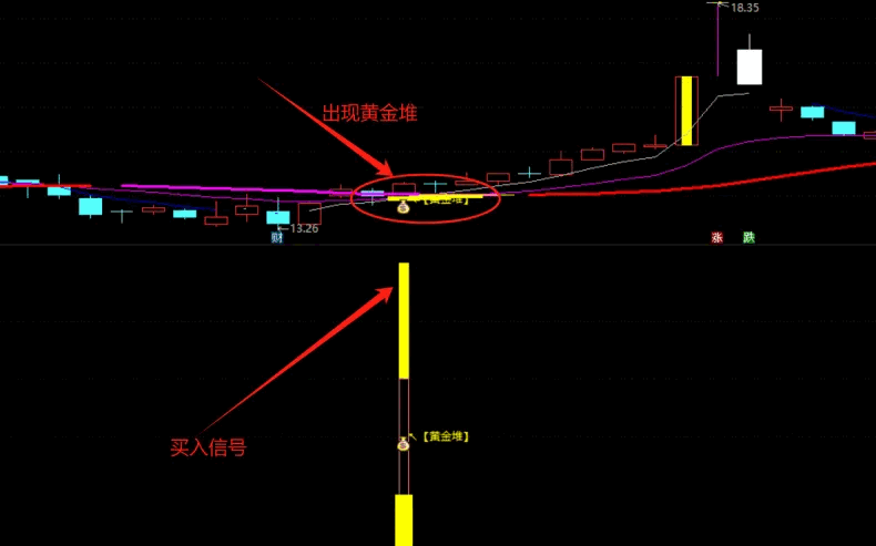 1、主图中出现“黄金堆”信号时为转折点,可“重点关注”;