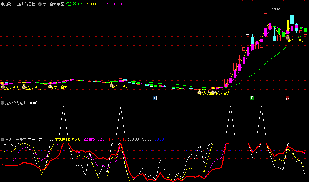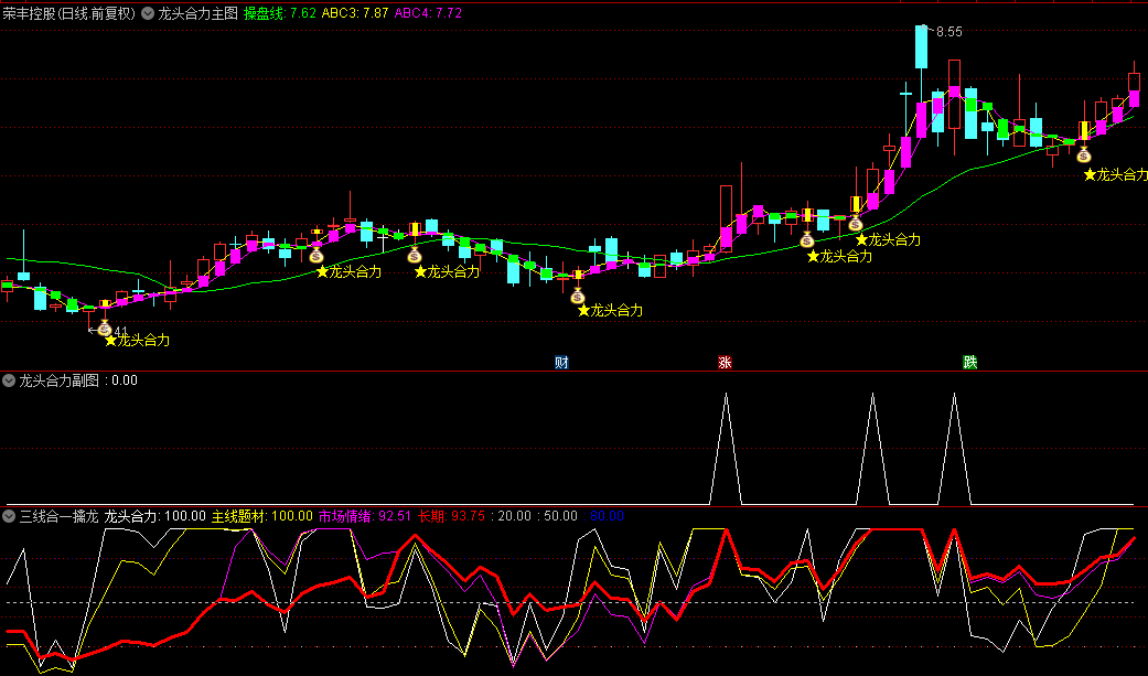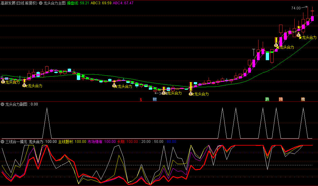 主图出现龙头合力信号后、副图三指标指标合一共振是确定性的买点。