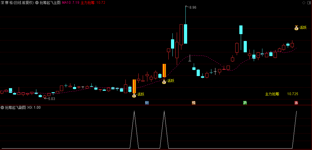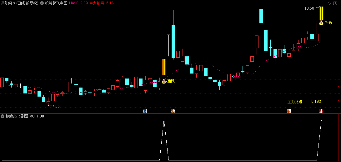 2、打开【抢筹起飞】主图,来观察选出的股票,观察是否有:“起飞”,前一日出现:“活跃”信号,则重点关注。