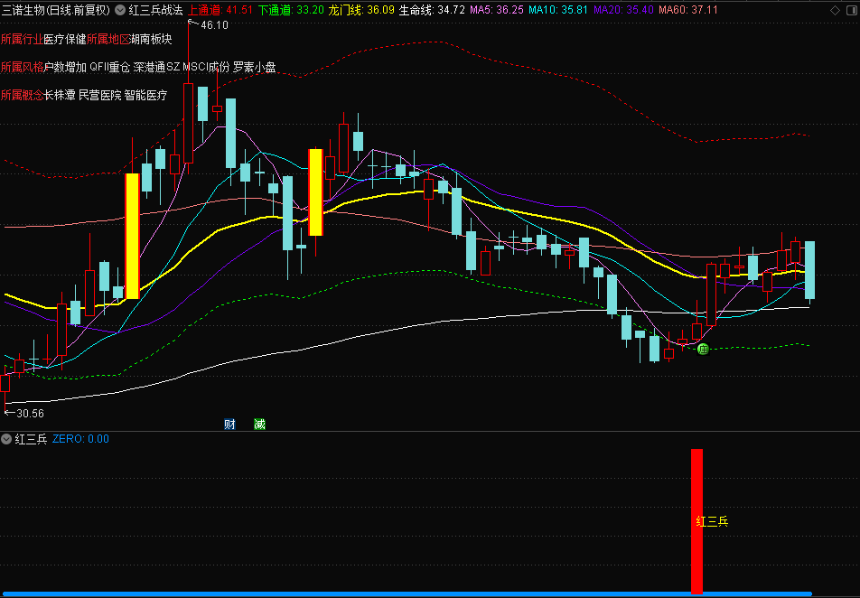 红三兵在盘面上的表现就是股价经过一段时间的低价整理后,出现连续的三根阳线。红三兵的出现伴随着底部量能的放大助推股价加速上扬。