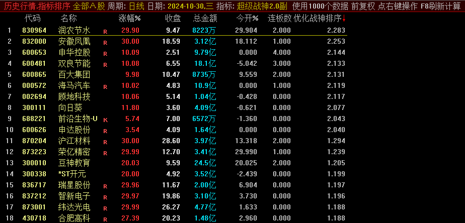 3、第二天,对昨日选出的股票,使用【战神排序2.0】排序。