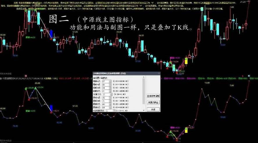 本套指标分为主、副图。以副图为主,主图只是中源线上叠加K线,主图和副图功能和操作相同。
