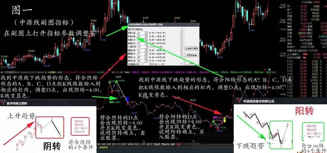 操作时要根据股价运行趋势,找出符合阴转或阳转的形态,在参数调整窗输入A、B、C、D四点的K线根数,