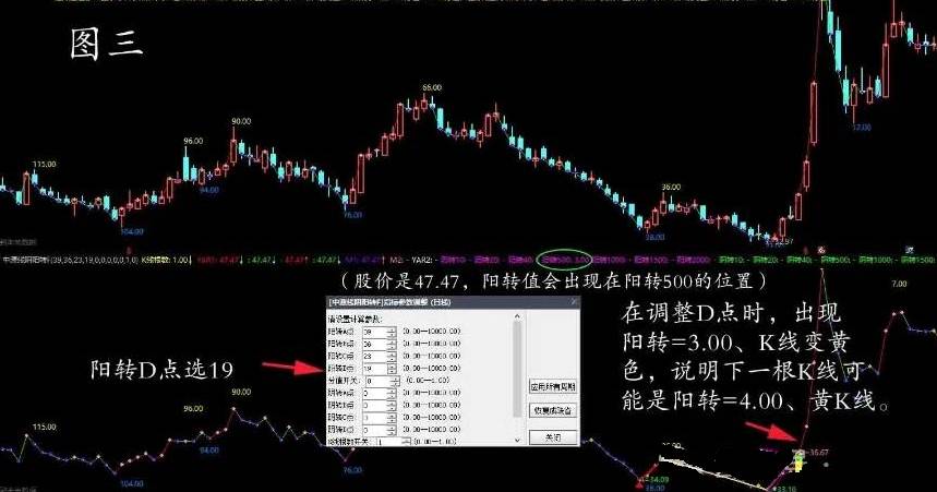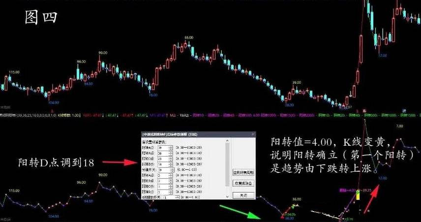 当阳转D点附近出现阳转=4.00,K线变黄色,就是阳转开始,考虑买入股票。(详细操作请看附图)