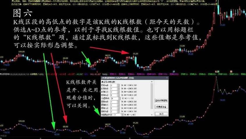 股价区间以收盘价为分类,例如10元的股票阳转10,500元的股票是阳转500, 其它类推。 同样,在参数调整窗内填进阴转A—D四点的K线根数,用来检测上涨形态的D点是否出现阴转,出现刚阴转会在D点和标题栏的与股价区间相应的阴转处显示为“4”,该K线变蓝色。所有4点的分值指标会自动计算。