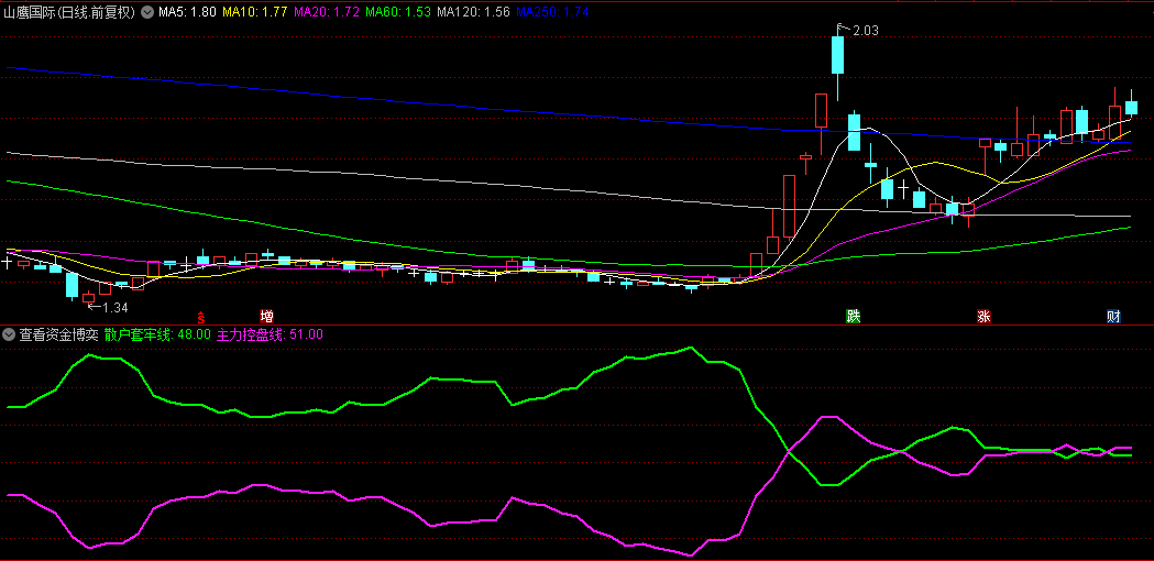 这是一个查看资金博奕副图指标,作为中长线指标是相当不错了,主力控盘线上穿散户套牢线即可看多,主力控盘线下穿散户套牢线即可规避风险。