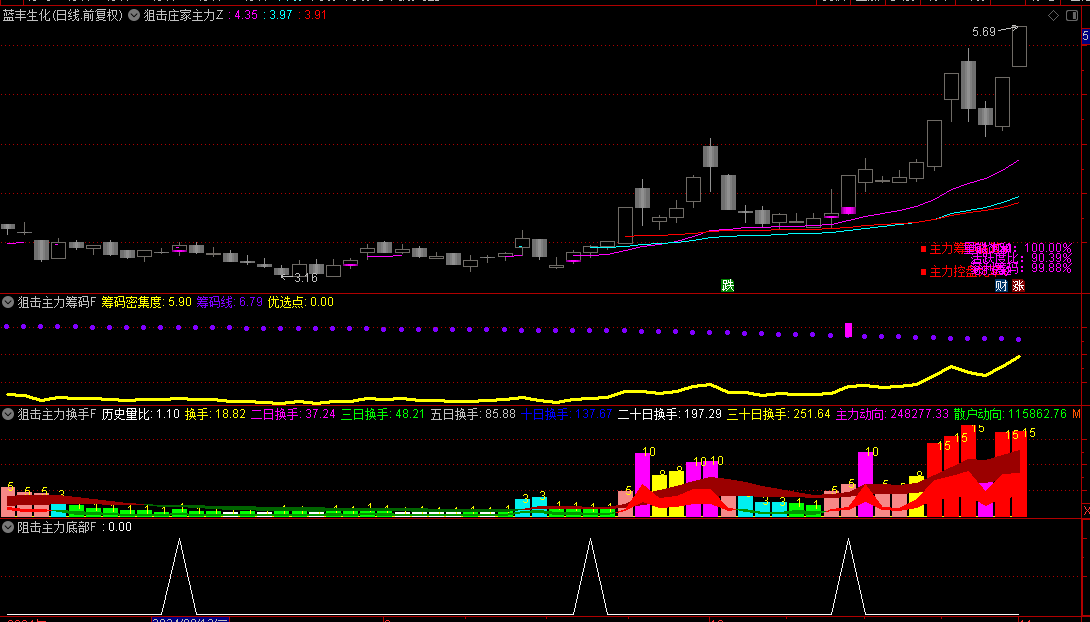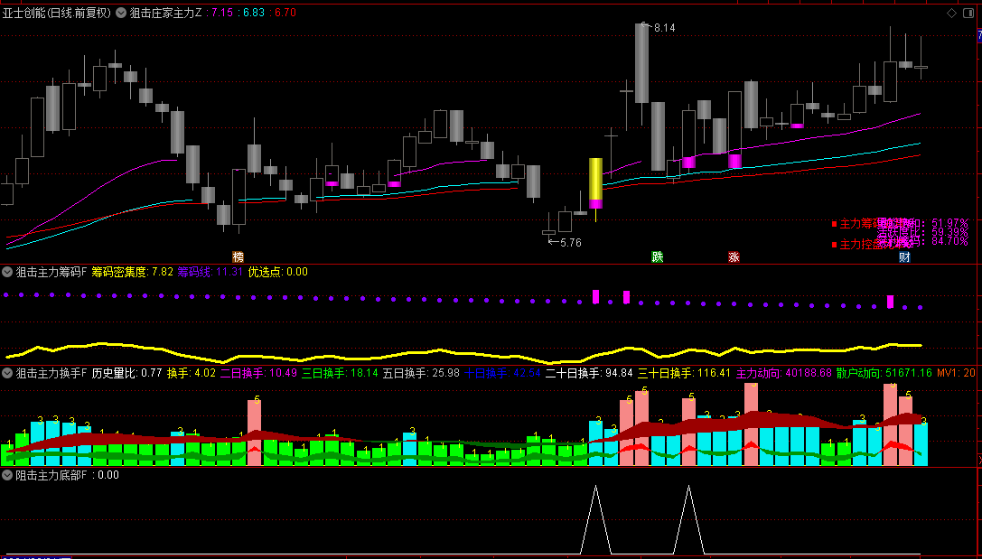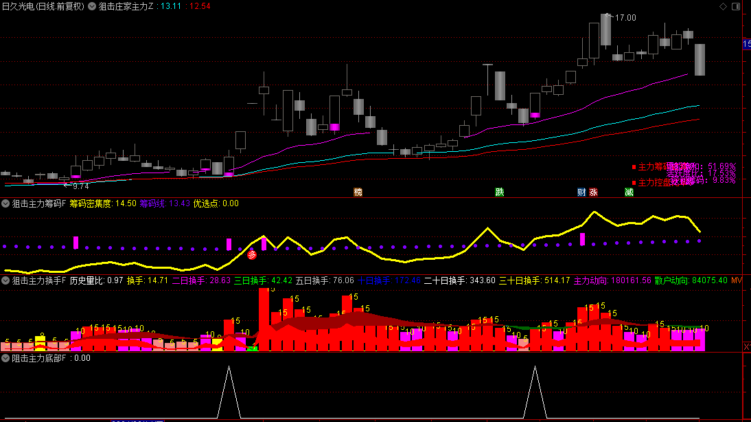 来自某知识付费群的【狙击庄家主力】套装指标,一主三副一选股总共五个指标,包含了狙击庄家主力Z主图+阻击主力底部副图+狙击主力换手副图+狙击主力筹码副图。