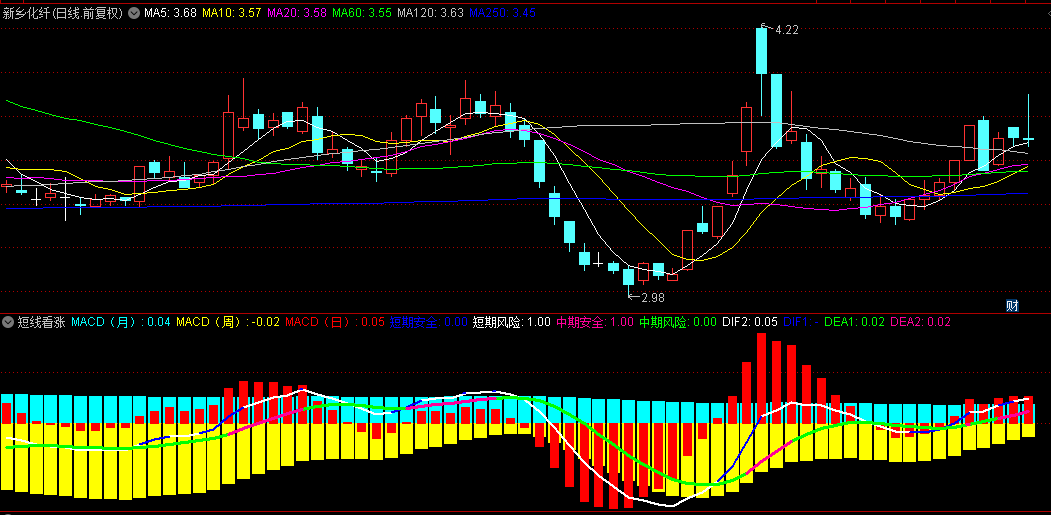 短线看涨指标属于副图公式,短线怎么操作?看蓝色短期安全线。