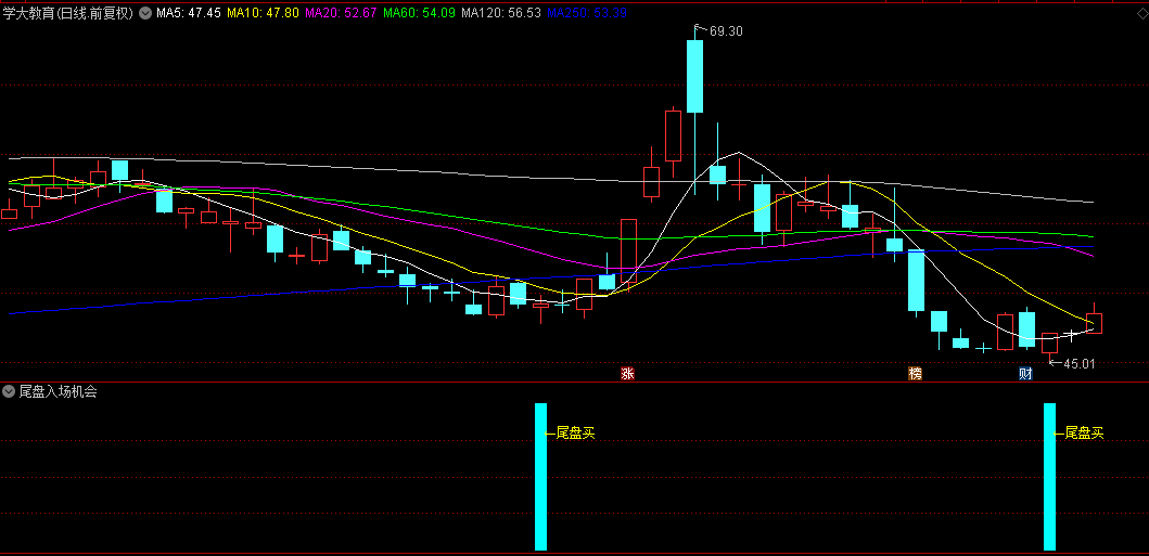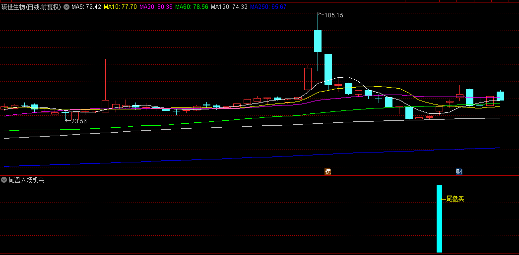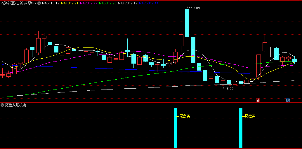 尾盘买副图指标满足条件仅触发一个信号,狠抓尾盘机会入场,尾盘在14点50分开始使用,选出有信号的个股,然后按照涨幅排序剔除涨幅大于5个点的个股,选择低位起涨且个股板块有一定热点的个股,买入后第二天则高点出,也就是精选第二天有冲高机会的个股获利了结。或持股一般不超过3天,涨幅较大可批量止盈,止损以-5为强制止损点,若第二天跌破买入当天的最低点则无条件止损,横盘调整可适当增加持股时间避免突然突破而错过大牛股的机会。指标不含未来函数,指标不漂移。