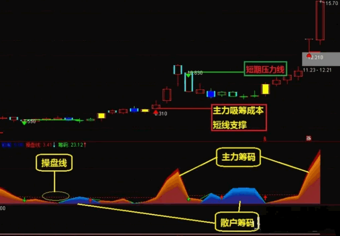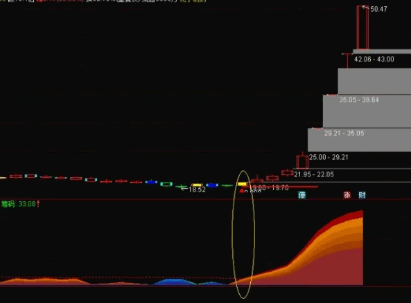 1、黄色筹码峰表示主力控盘筹码比例明显高于散户筹码,象征金色火焰山,代表收获时节;