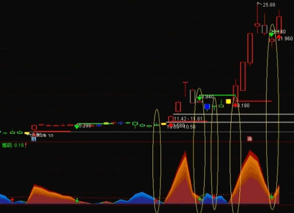 3、黄色实休K线,是行情启动信号,表示主力完成低位吸筹,准备开启一轮行情。