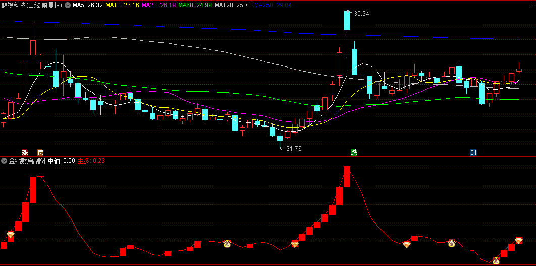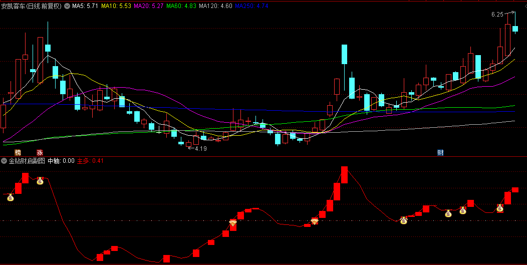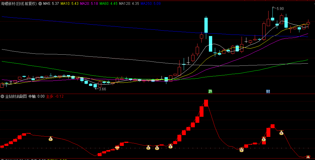 3、在黄钻石信号出现的同时,若股票价格成功站上10日均线,并且伴随着红色柱子的持续显示,红钻钱袋将发出钱袋子信号。这是最为明确的买入信号,表明股价已经具备强劲的上涨动能,可以考虑积极参与。